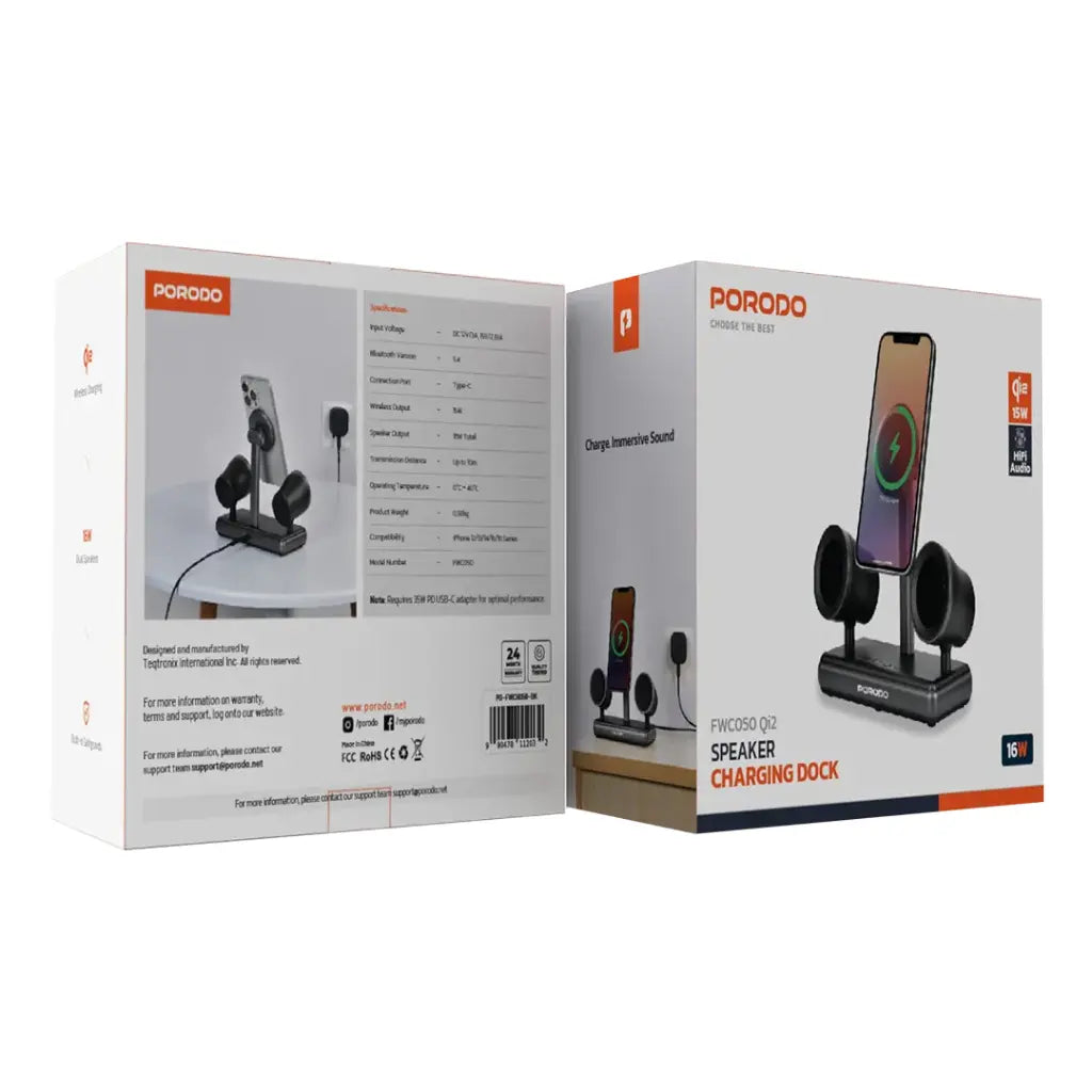 Porodo Speaker Charging Dock – 15W Wireless Charger with Dual 16W HiFi Speakers