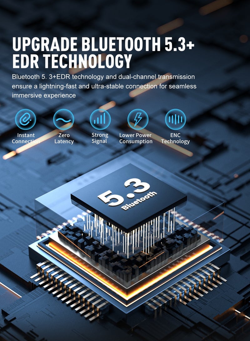 <strong>Bluetooth 5.3:</strong> Ultra-stable wireless connection with low latency, ensuring smooth audio and minimal disconnections even in complex environments.</li>