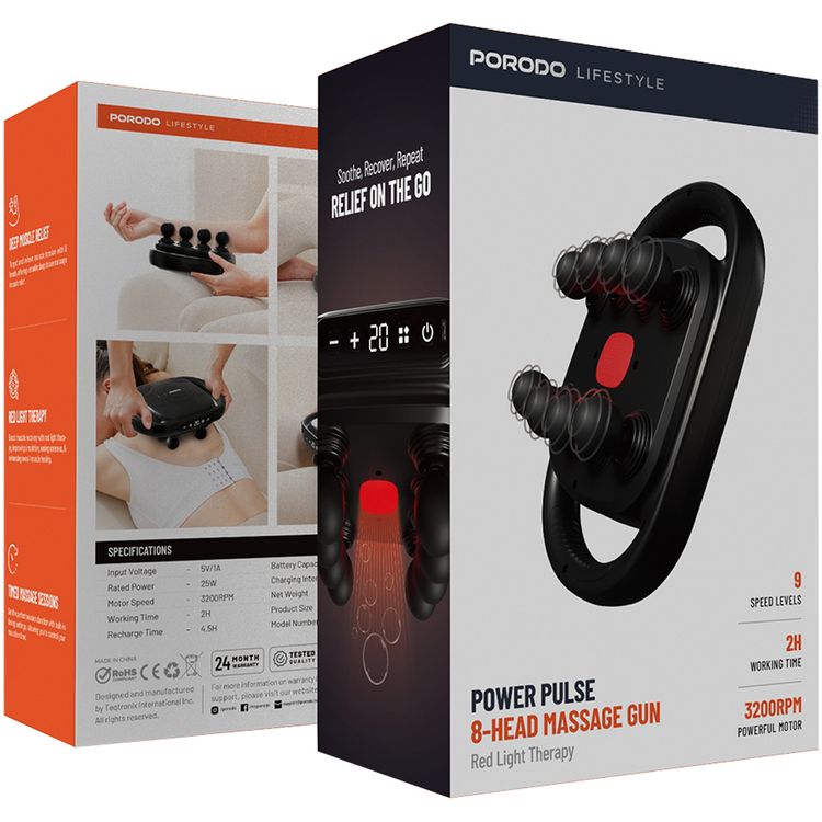 Porodo Lifestyle Power Pulse 8-Head Massage Device – Deep Tissue Relief with Red Light Therapy