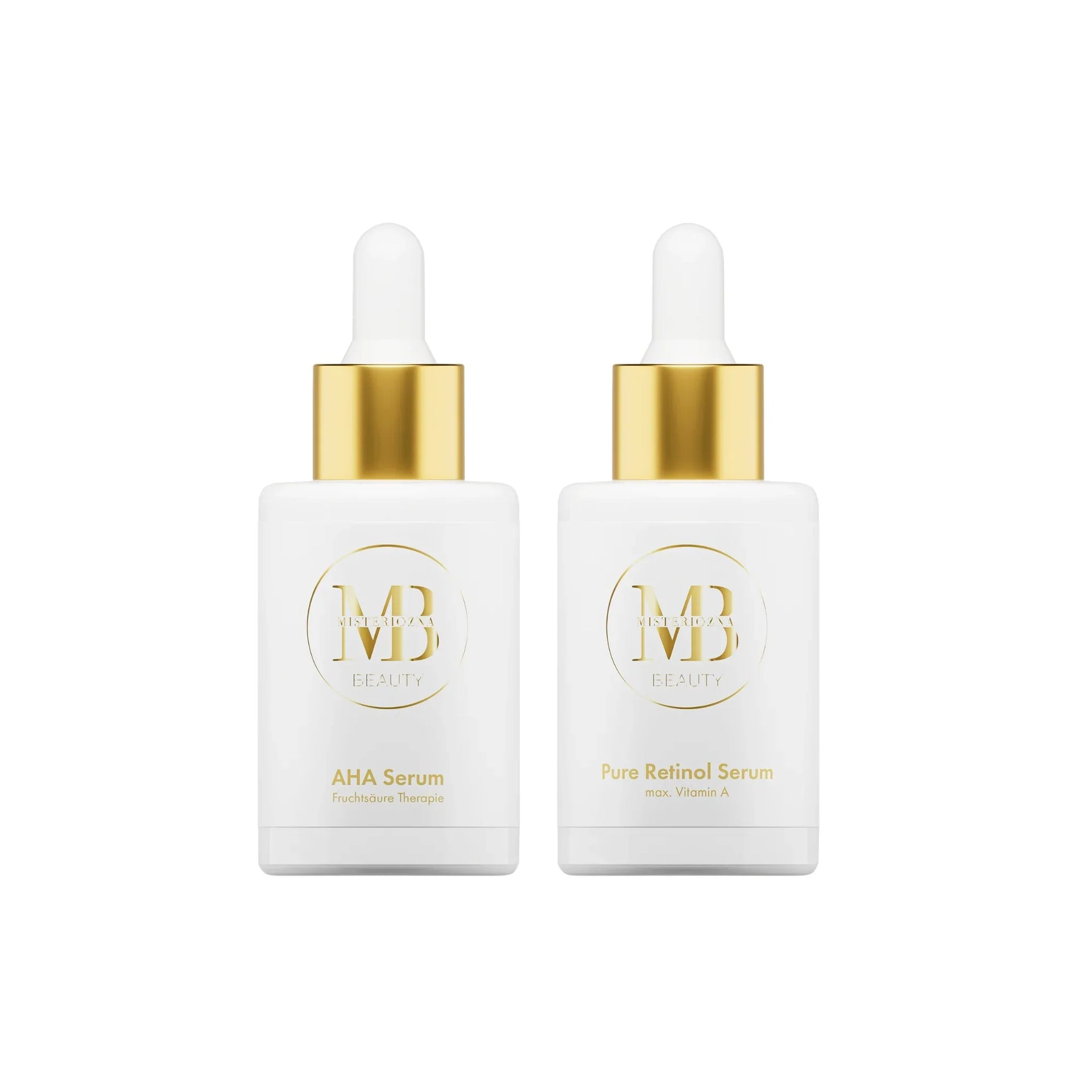 Translation missing: ar.<ul><li>Das <strong>Glow & Renew Set</strong> vereint zwei hochwirksame Produkte für eine umfassende Hauterneuerung: das AHA Serum und das Pure Retinol Serum. Dieses Set ist ideal für alle, die ihrer Haut eine intensive Glättung, Reduzierung von Unreinheiten und einen strahlenden Teint schenken möchten. Das AHA Serum exfoliert sanft die Hautoberfläche, während das Pure Retinol Serum die Hauterneuerung beschleunigt und feine Linien sowie Poren reduziert. Zusammen sorgen sie für ein jüngeres, ebenmäßigeres Hautbild.</li></ul>