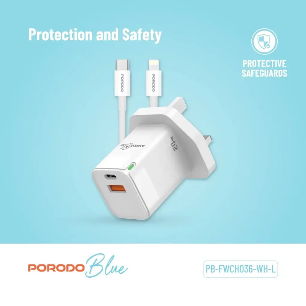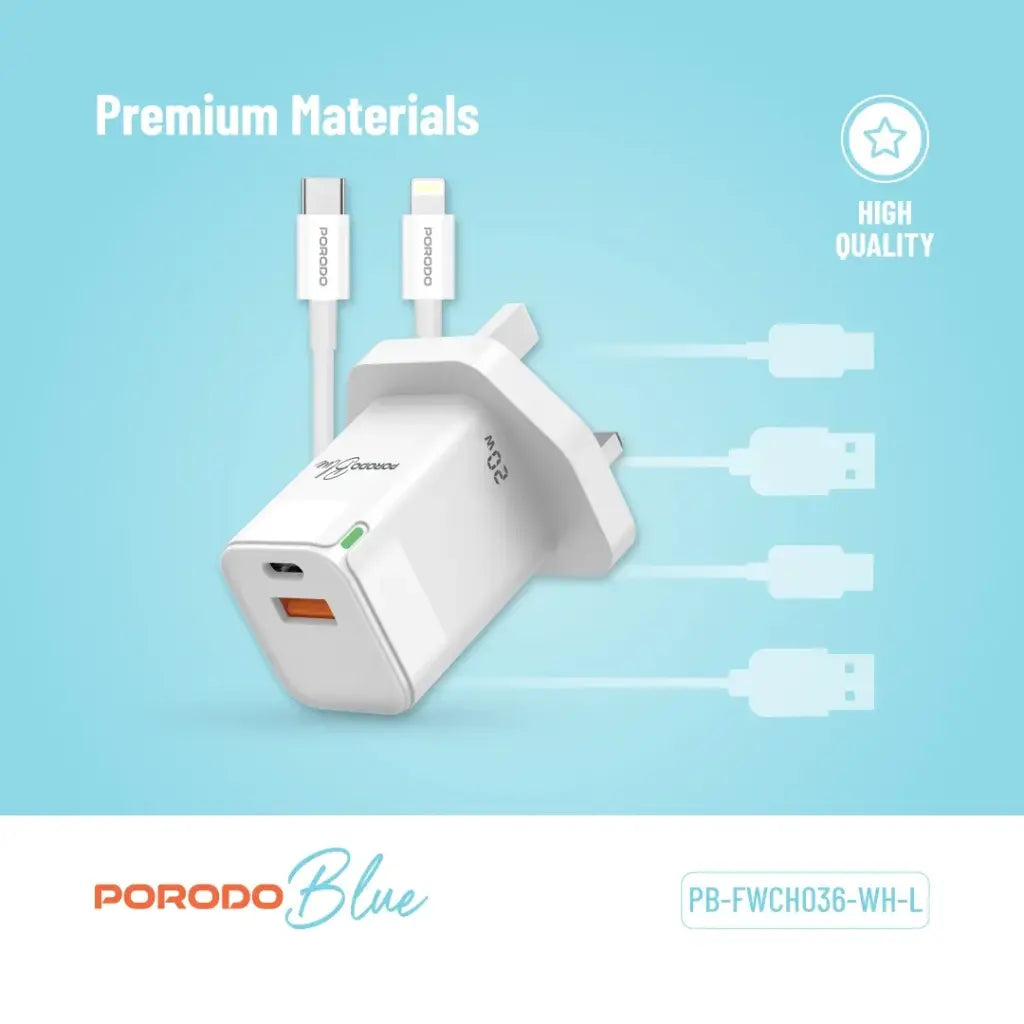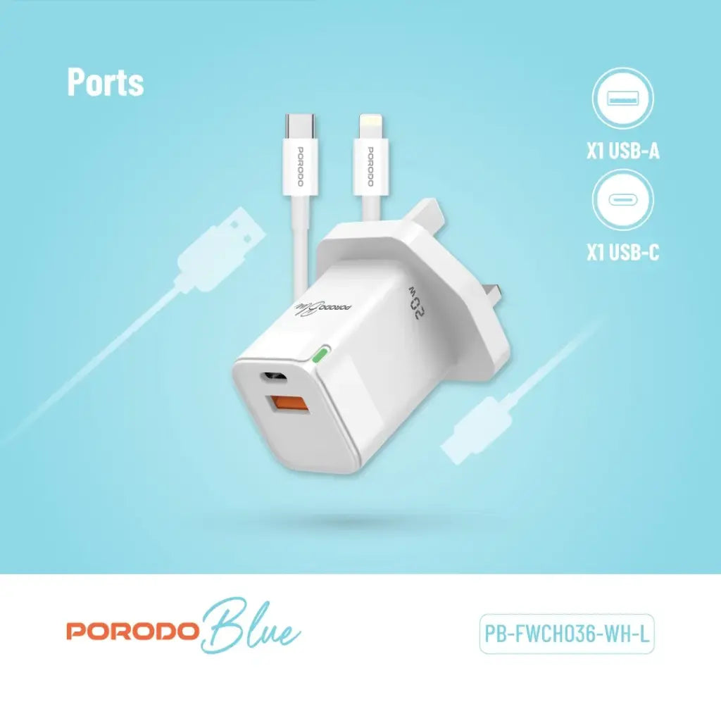 Porodo Blue Ultra-Quick Charger USB-A to USB-C (1m Lightning Cable Included) - White