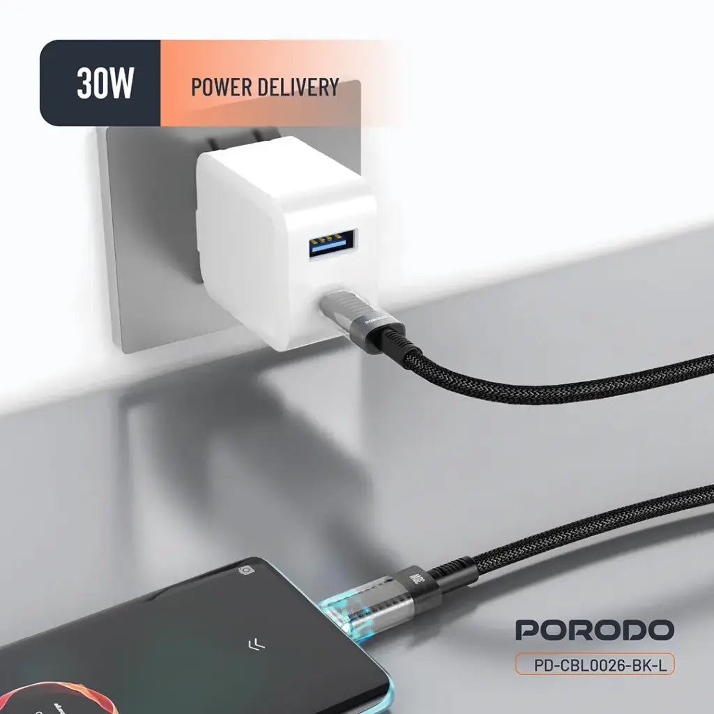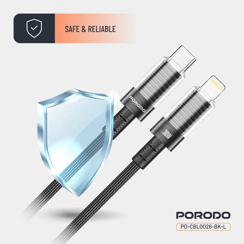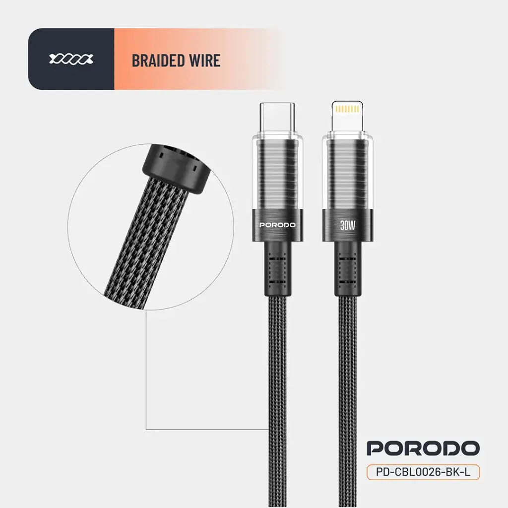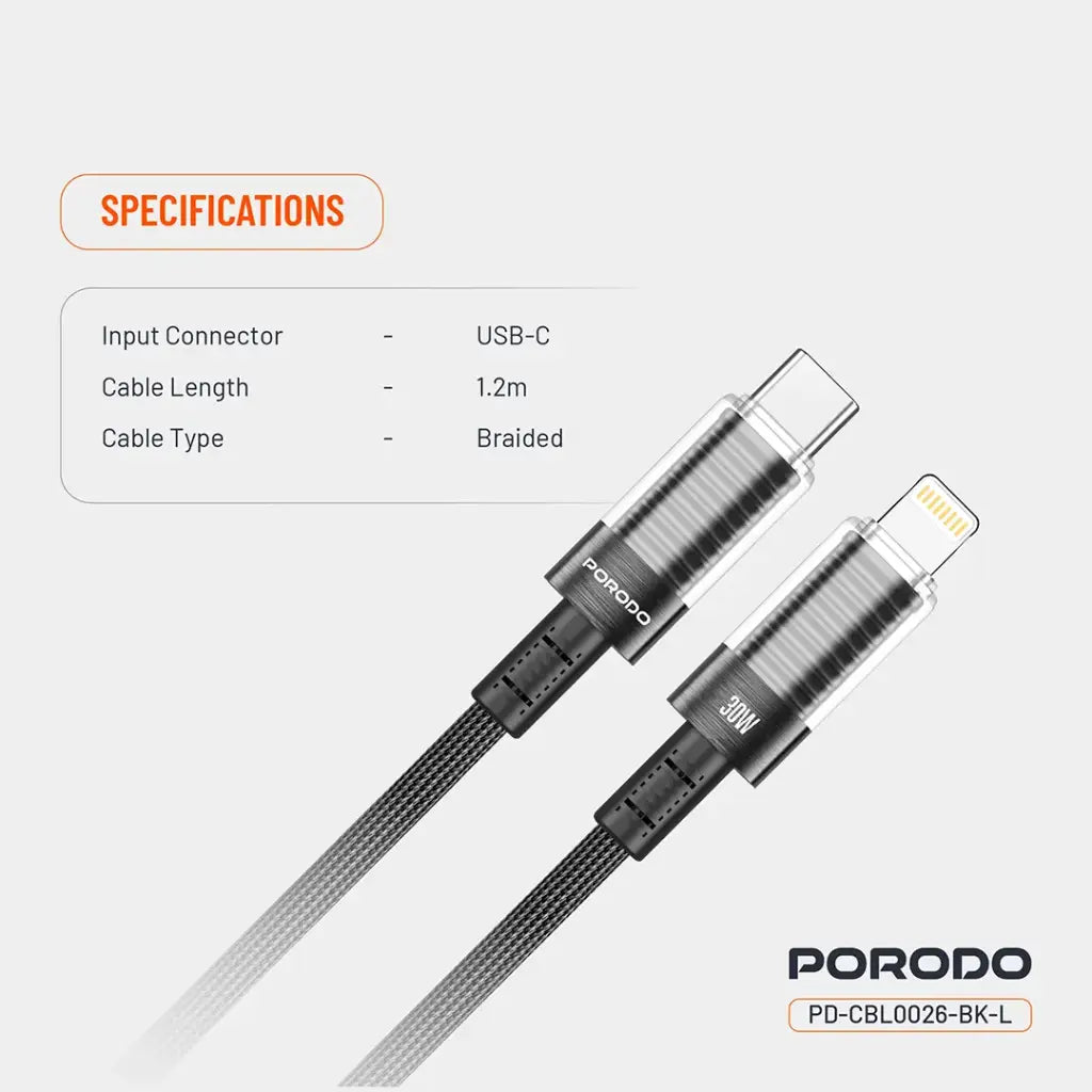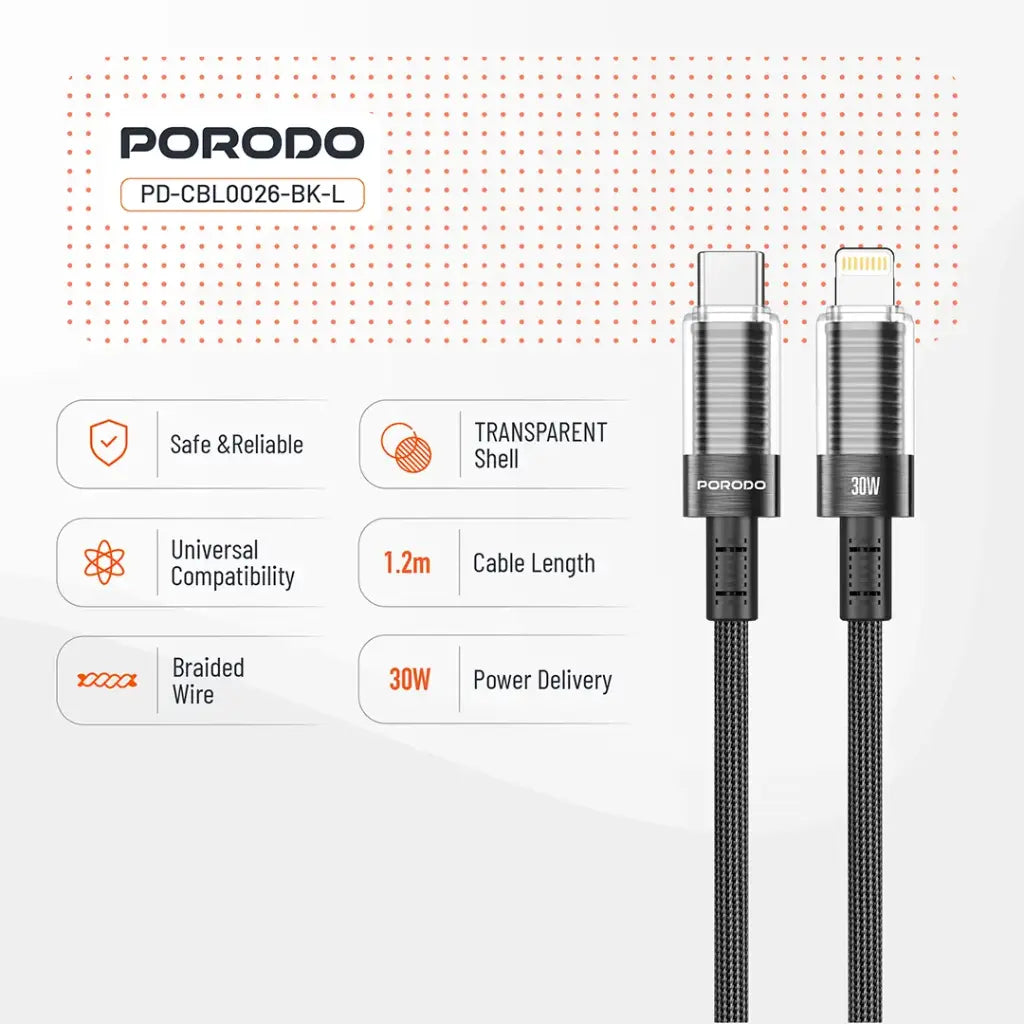 Porodo Transparent Shell USB-C to Lightning Cable – 1.2m Braided, Fast Charging & Data Transfer