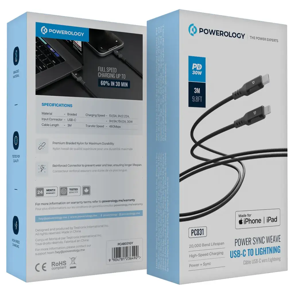 Powerology Power Sync Weave USB-C to Lightning Cable 3m – Braided, PD 30W Fast Charging, 480Mbps Data Transfer, 20,000 Bend Lifespan, Durable High-Speed Charging & Sync Cable