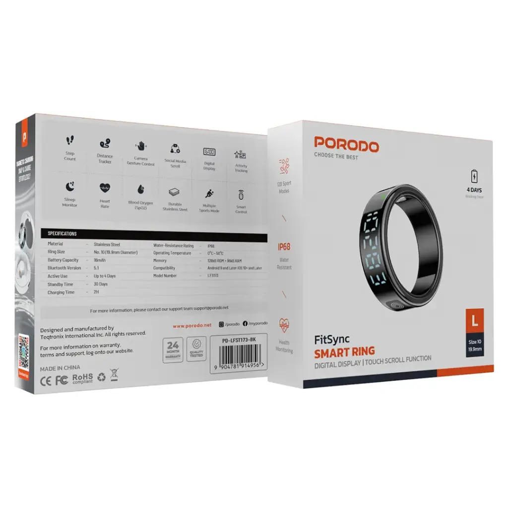Translation missing: ar.<p>The <strong>Porodo FitSync Smart Ring</strong> combines style, durability, and advanced functionality in a sleek stainless steel design. Available in sizes 10 (19.9mm diameter) and 7 (17.3mm diameter), it offers a comfortable fit for all-day wear.</p>