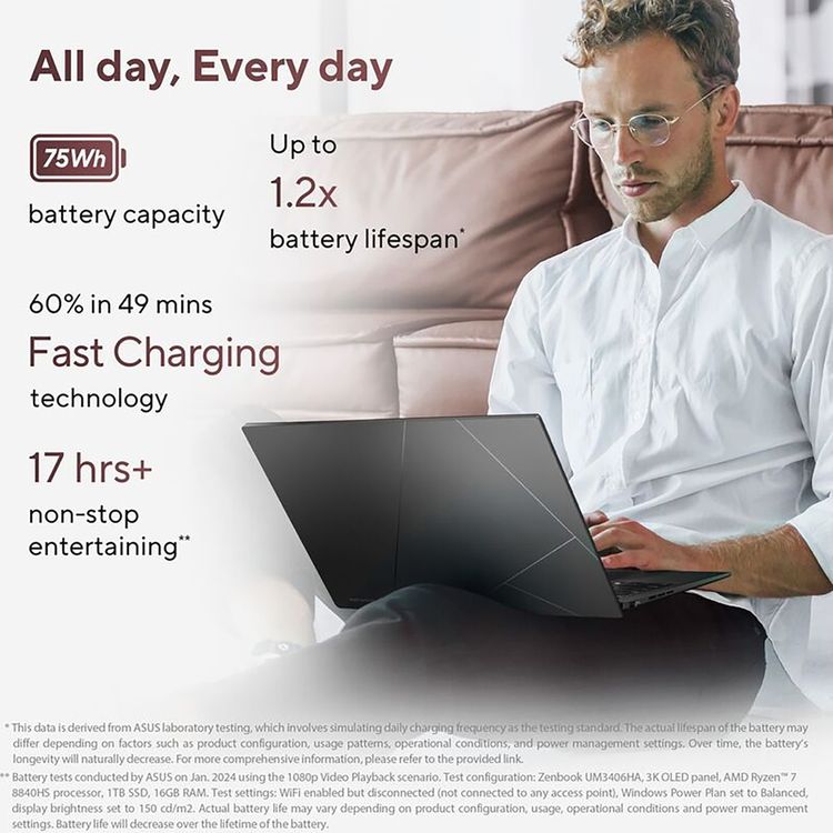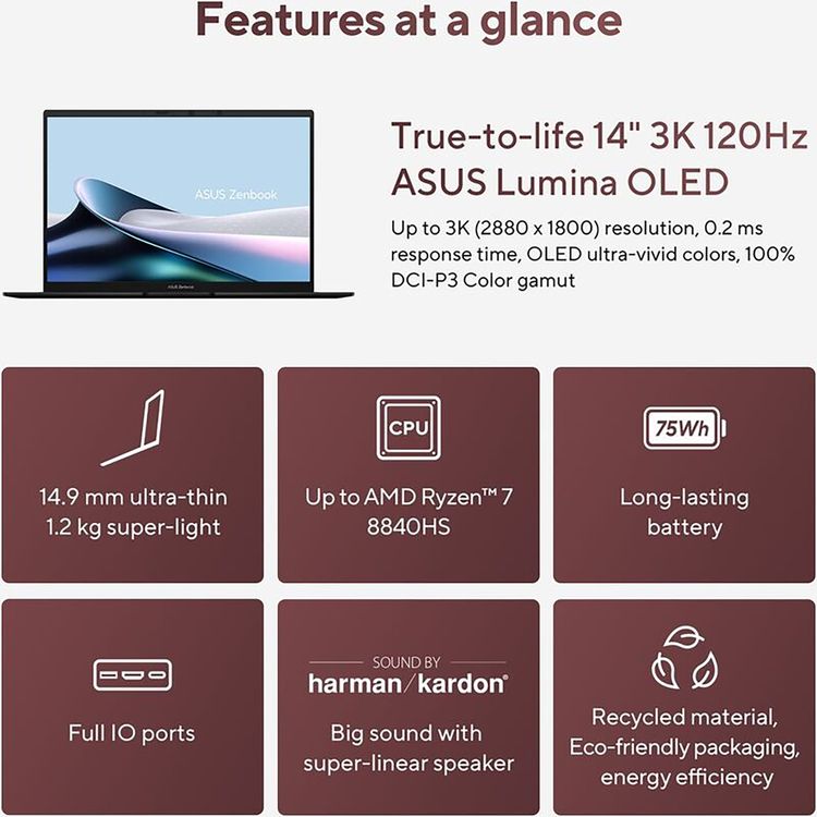 ASUS Zenbook 14 OLED Laptop - AMD Ryzen R7-8840HS, 16GB RAM, 1TB SSD, AMD Radeon Graphics, 14-inch FHD OLED, Windows 11 Home - Jade Black