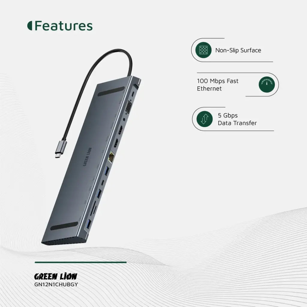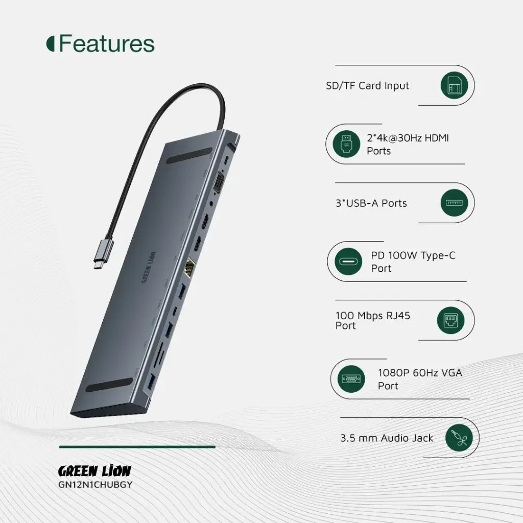 Green Lion 12-in-1 4K HDMI Ethernet USB-C Hub with 100W PD & Dual HDMI