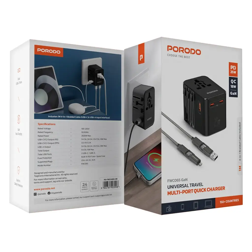 [PD-FWCH065-BK] Porodo GaN Universal Travel Multi-Port Quick Charger – Black