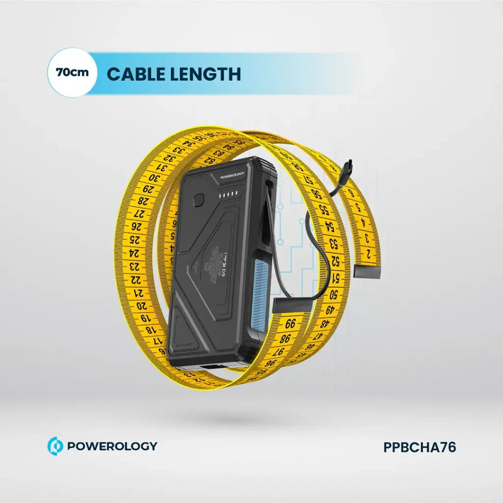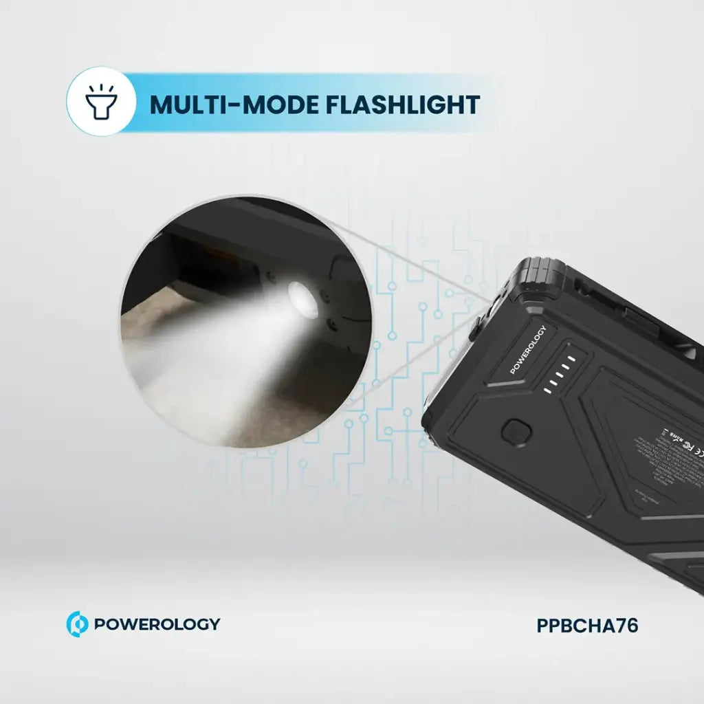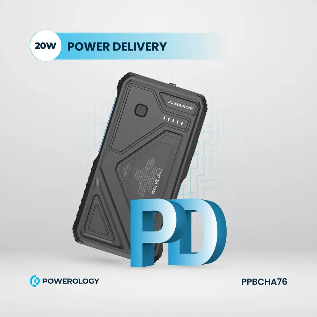 Powerology 20000mAh Solar Power Bank – PD 20W Fast Charging, 15W Wireless, IP54 Water Resistant, 4-Port Output, Built-in Flashlight – Ideal for Camping, Travel & Emergencies