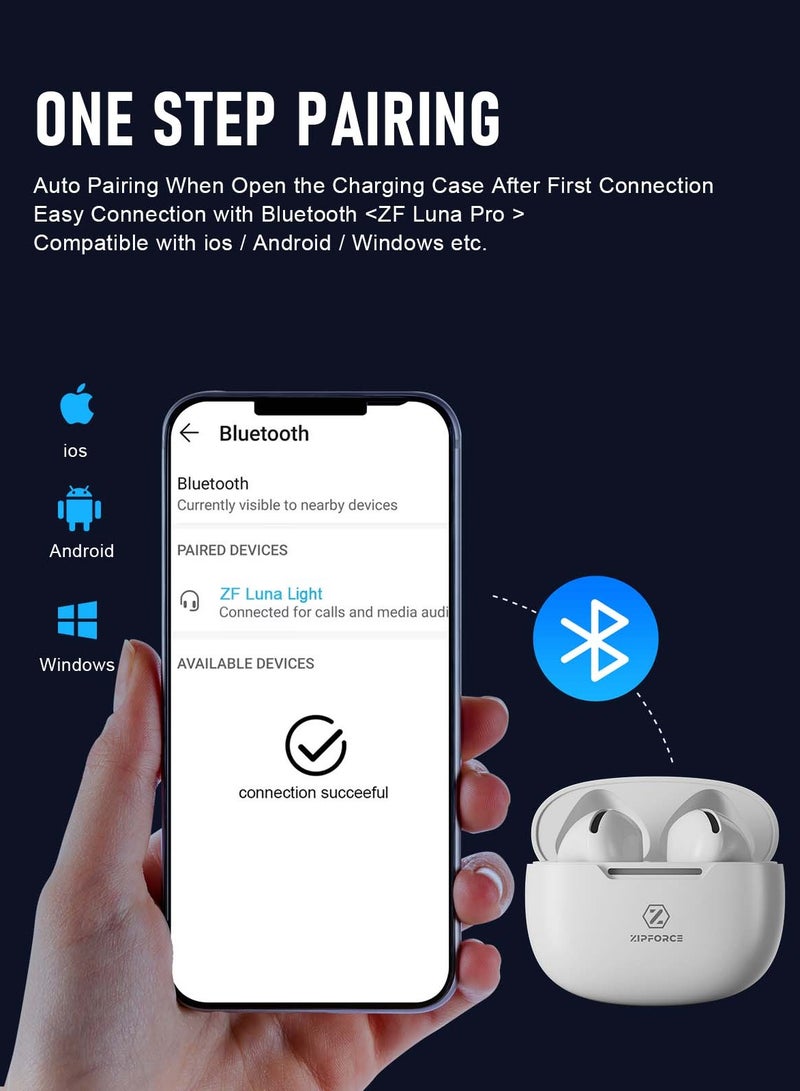 <p>The <strong>ZIPFORCE Luna Light</strong> is a 2024 standard-configuration semi-in-ear true wireless headphone designed for seamless connectivity, premium sound quality, and long-lasting battery life. Compatible with both iOS and Android devices, these earbuds deliver comfort, style, and convenience in one lightweight package.</p>