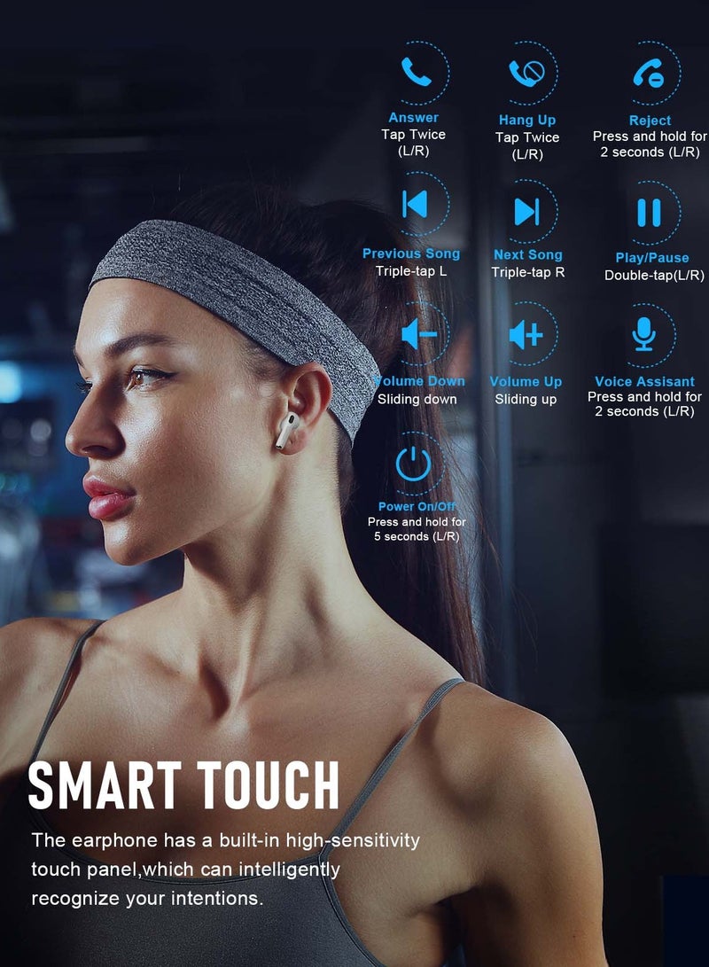 <strong>Touch Controls:</strong> Dual-ear touch control allows you to skip tracks, pause/play music, answer calls, and activate your voice assistant effortlessly.</li>